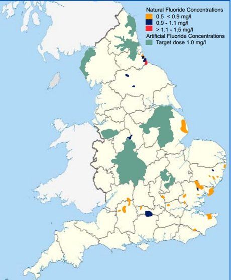 The areas fluoridated are the entire West Midlands and West Cumbria and parts of the North East and Northumberland, Lincolnshire, Nottinghamshire, Leicestershire, Cheshire and Bedfordshire. Places with appreciable natural fluoride (calcium fluoride in the main) are Hartlepool, the coastal areas on Essex, a very small uninhabited area to the east of Newbury and Uttoxeter